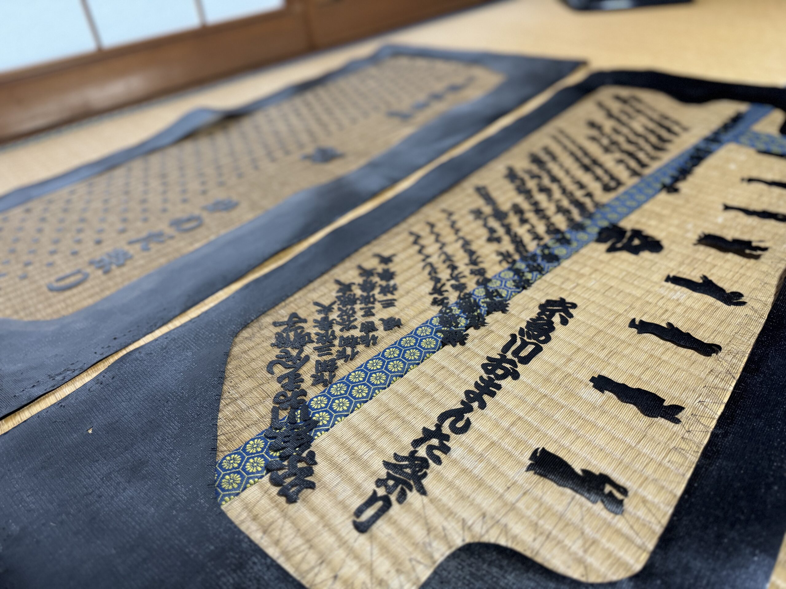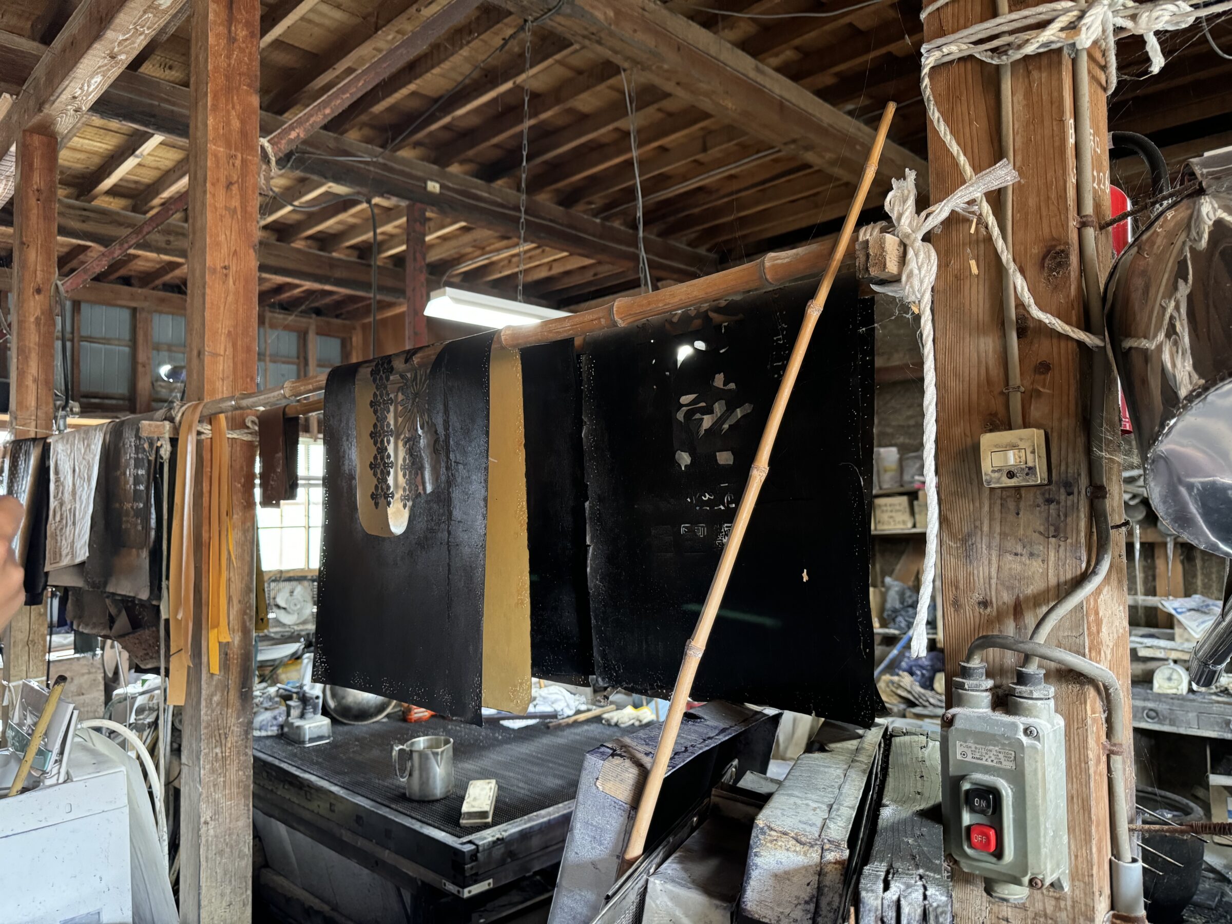 現在、蔵ギャラリーでは、かつて染められていた手拭いと、染めに使われていた型紙の展示が行われている。布に色をのせるだけではなく、図案を考え、型紙を彫り、一枚一枚に色を染み込ませていく――そんな手仕事の工程と時間を、静かに感じることができる展示だ。シャッターの向こう側で行われていたものづくりを、今、目に見えるかたちで知ることができる場所でもある。
