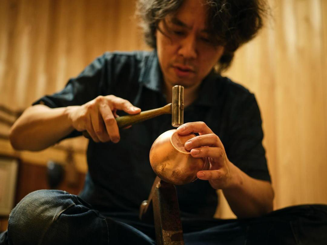 さらに須佐さんは、伝統技術を守るだけでなく、独自の技術や加工方法も考案しています。金属の光や質感を活かした作品は、器でありながら彫刻のような存在感を放っています。滑らかな曲線、銅の柔らかな光、そして鎚が刻むリズム。須佐真さんの作品は、日常の道具でありながら、同時に金属から生まれるアートとも言えるでしょう。